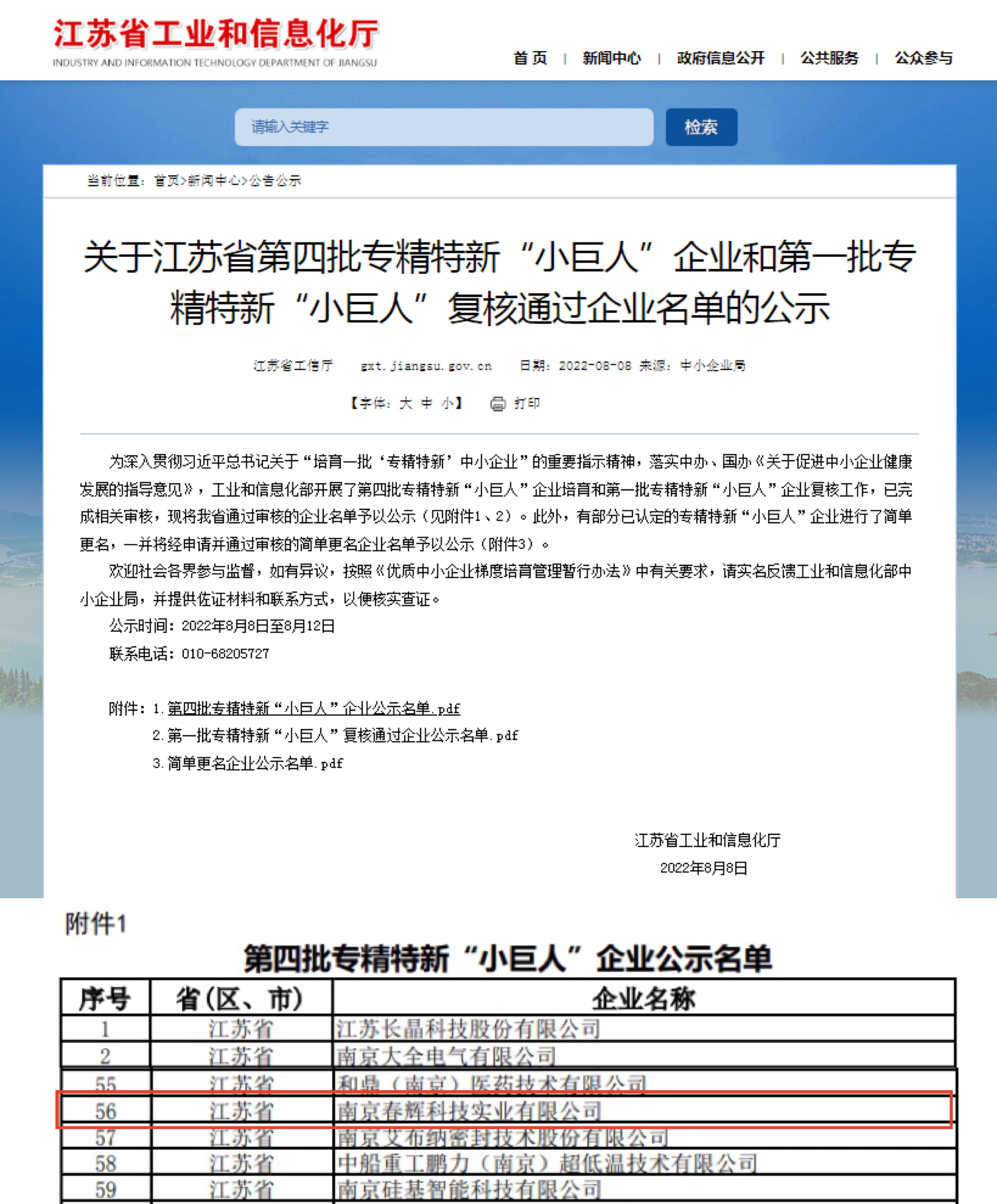 為深入貫徹習(xí)近平總書(shū)記關(guān)于“培育一批‘專精特新’中小企業(yè)”的重要指示精神,落實(shí)中辦、國(guó)辦《關(guān)于促進(jìn)中小企業(yè)健康發(fā)展的指導(dǎo)意見(jiàn)》,工業(yè)和信息化部開(kāi)展了第四批專精特新“小巨人”企業(yè)培育工作。2022年8月8日,江蘇省工業(yè)和信息化廳公示了全國(guó)第四批專精特新“小巨人”企業(yè)名單,南京春輝科技實(shí)業(yè)有限公司脫穎而出,被認(rèn)定為國(guó)家級(jí)專精特新“小巨人”企業(yè)。
