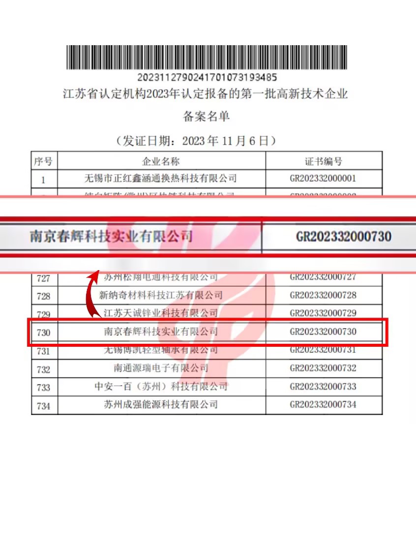 11月27日,根據(jù)《高新技術(shù)企業(yè)認(rèn)定管理辦法》和《高新技術(shù)企業(yè)認(rèn)定管理工作指引》有關(guān)規(guī)定,全國高新技術(shù)企業(yè)認(rèn)定管理工作領(lǐng)導(dǎo)小組辦公室發(fā)布了江蘇省認(rèn)定機(jī)構(gòu)2023年認(rèn)定報(bào)備的第一批高新技術(shù)企業(yè)名單,春輝公司順利通過復(fù)審認(rèn)定,再次被授予國家高新技術(shù)企業(yè)稱號。